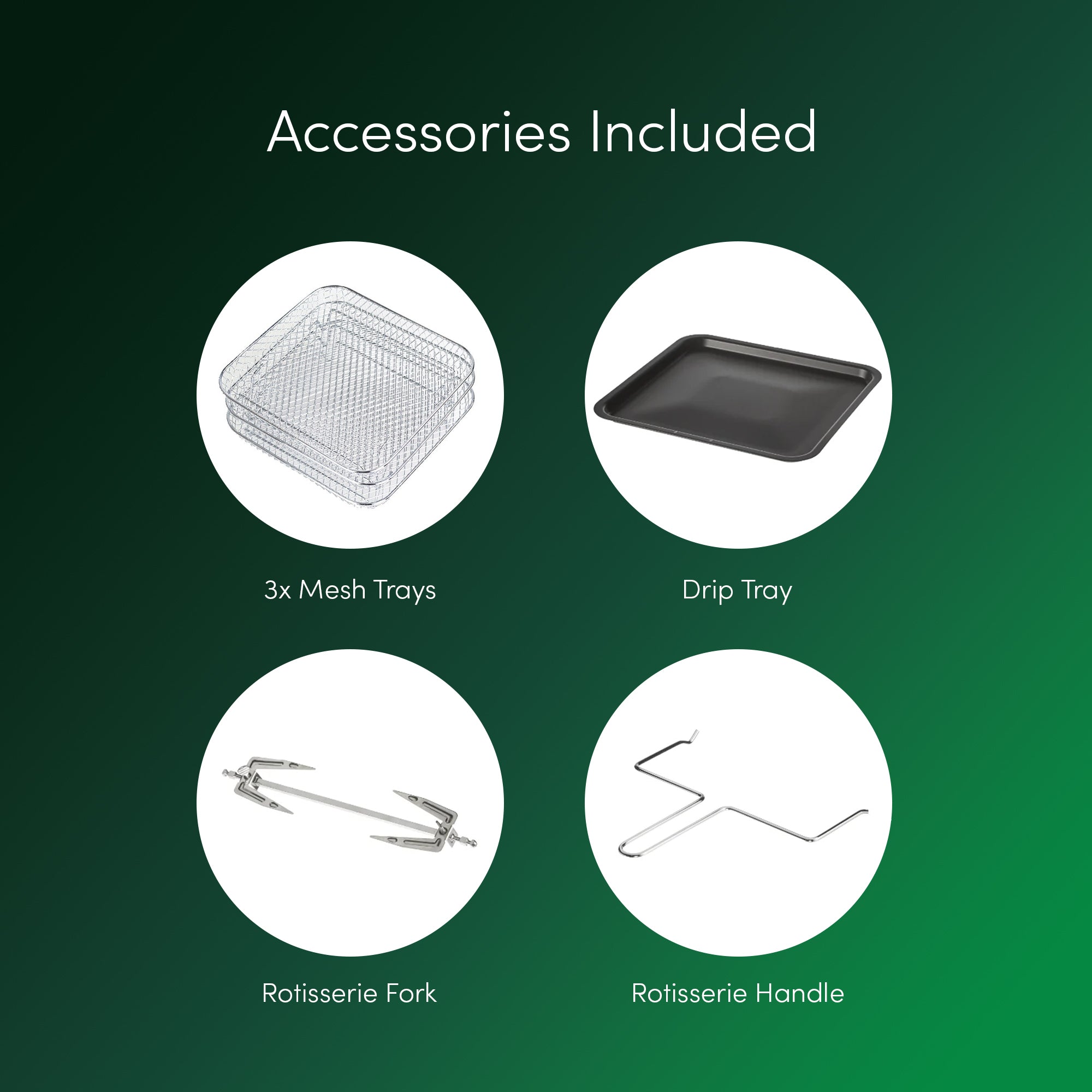 Large 12L Capacity - Designed to cook meals for the whole family, this 12 Litre air fryer includes 3 mesh trays, 1 drip tray, fork and rotisserie set. This multi-functional oven will allow you to cook, grill, fry, oven bake and rotisserie your favourite foods with little to no oil.