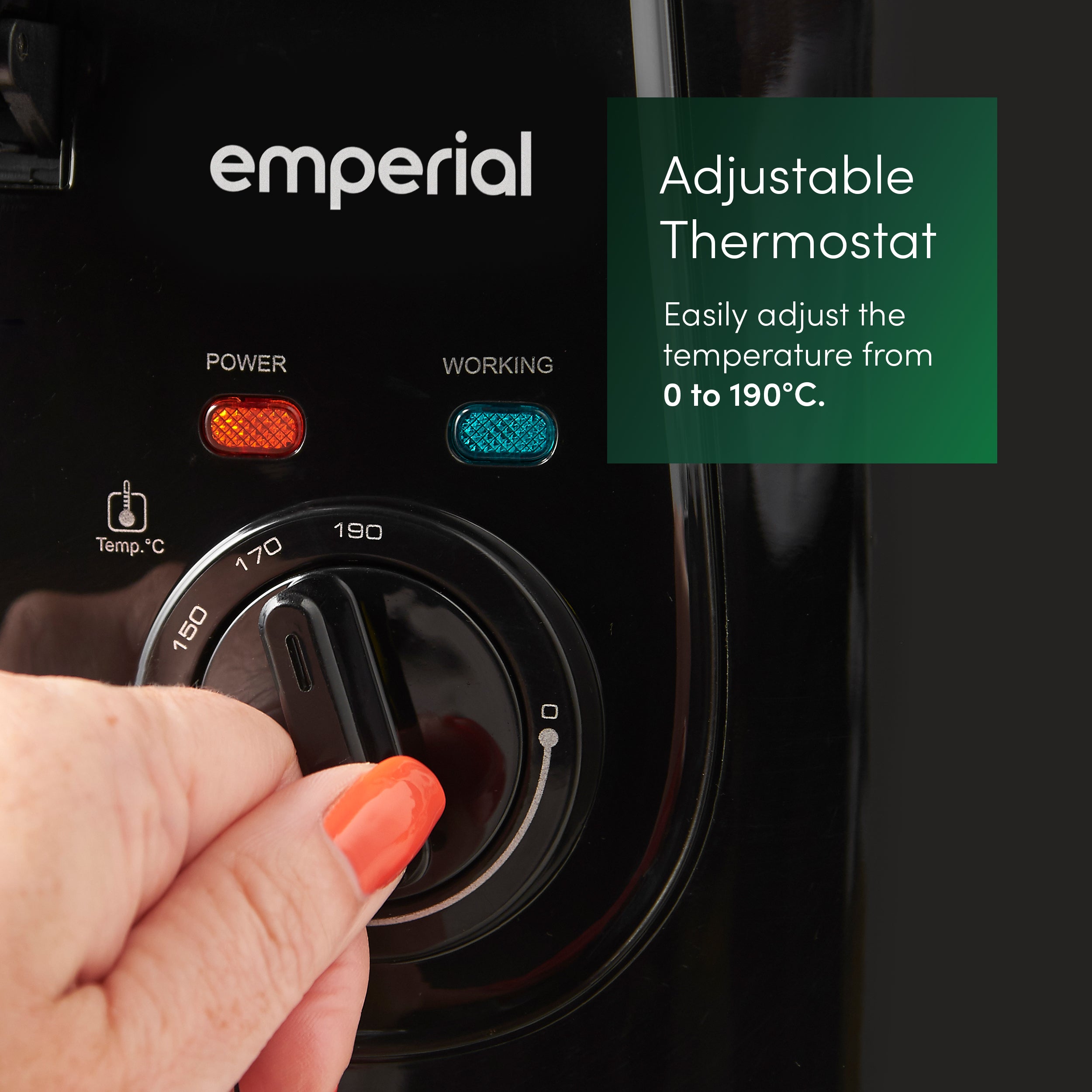 - Adjustable Temperature - A fully adjustable thermostat from 0°C - 190°C allows you to take complete control when cooking your favourite recipes. Comes with recommended cooking times guidelines on the front of the appliance for perfect results every time.