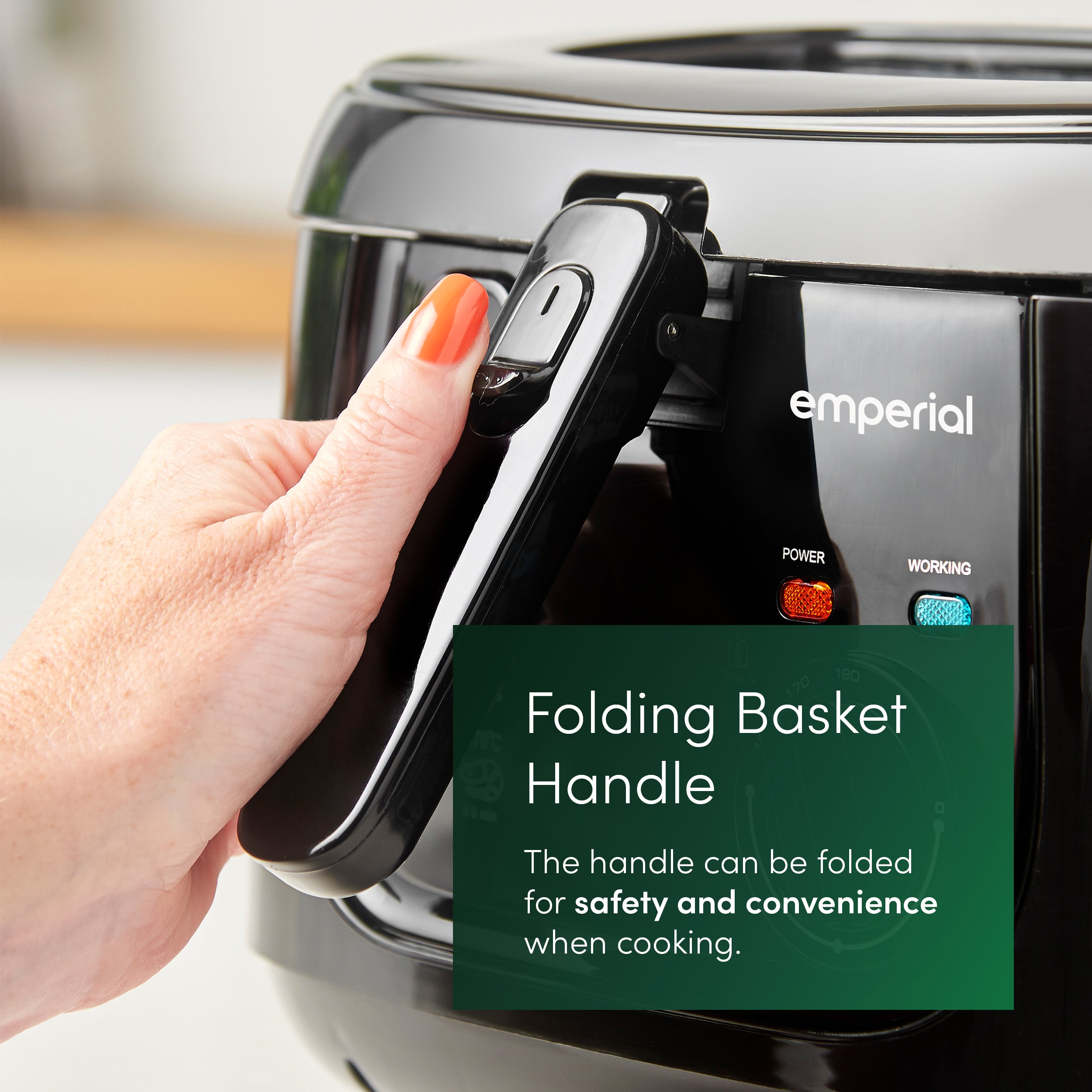 - Folding Basket Handle - For optimum safety, the cool touch basket handles will always remain outside the chamber allowing the lid to close. The basket handle can be folded down when in use to avoid unnecessary accidents.