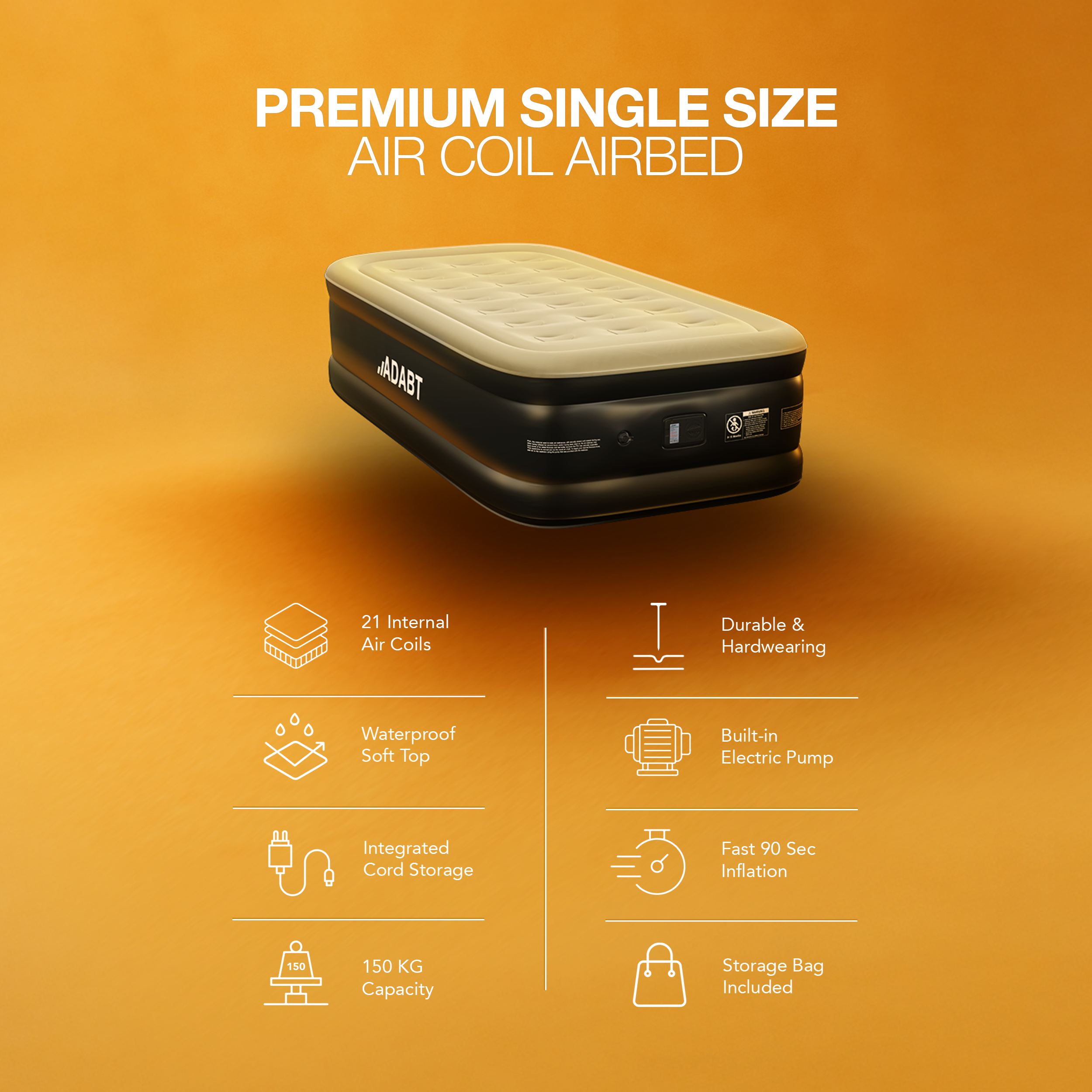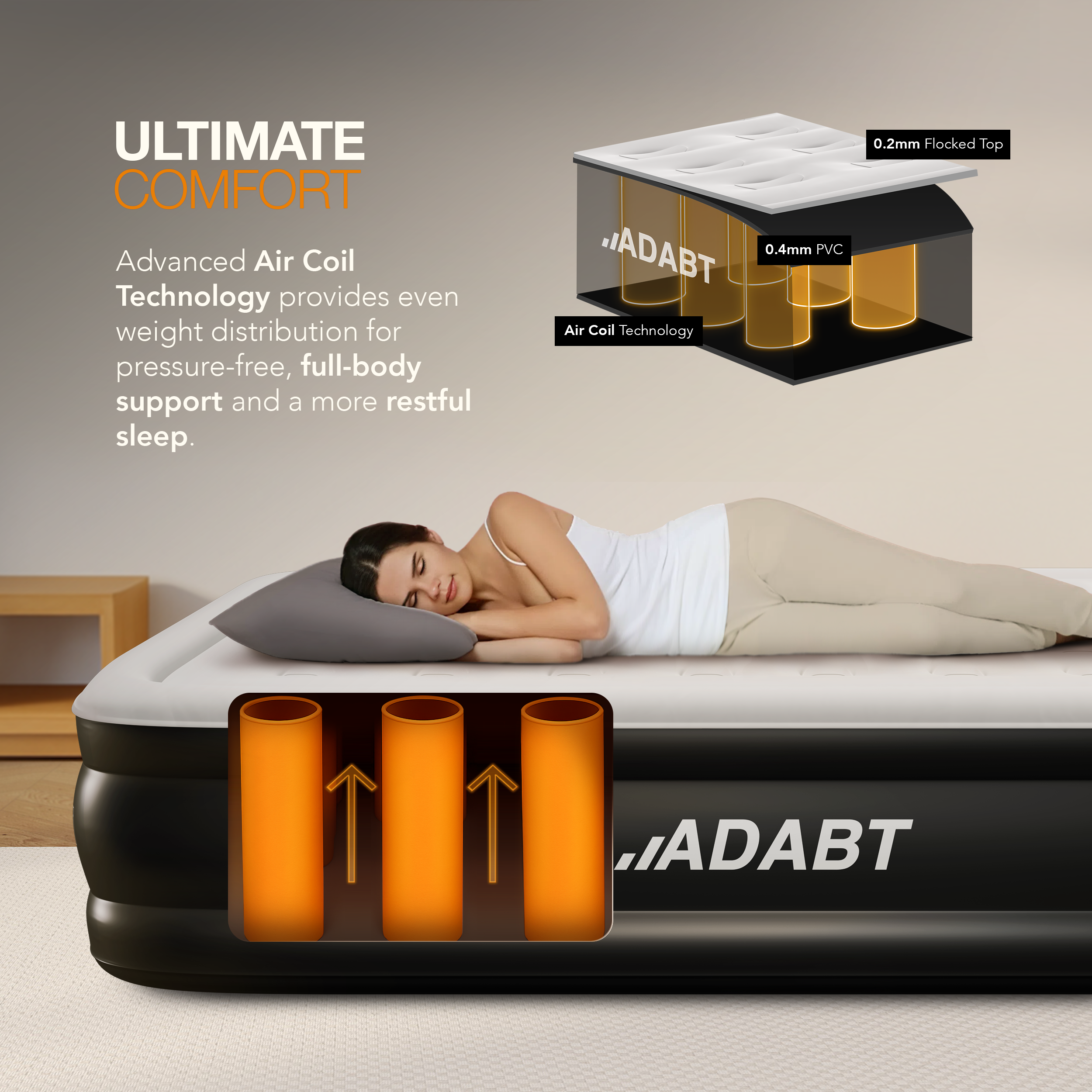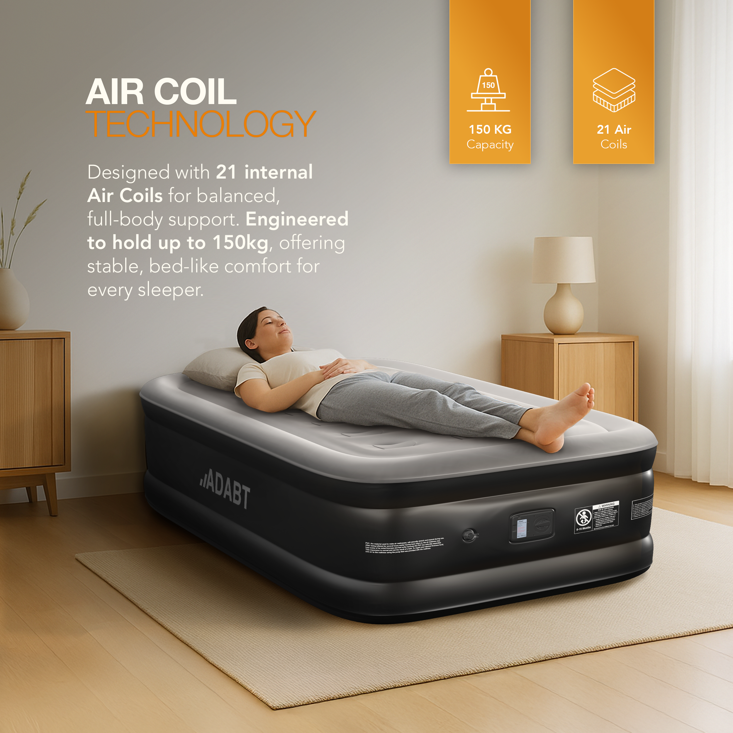 - Full-Body Support: Designed with 21 internal air coils, the ADABT mattress offers excellent head-to-toe support and even weight distribution. This reduces the common “dip” effect seen in traditional air beds and helps promote better back support and sleep quality.