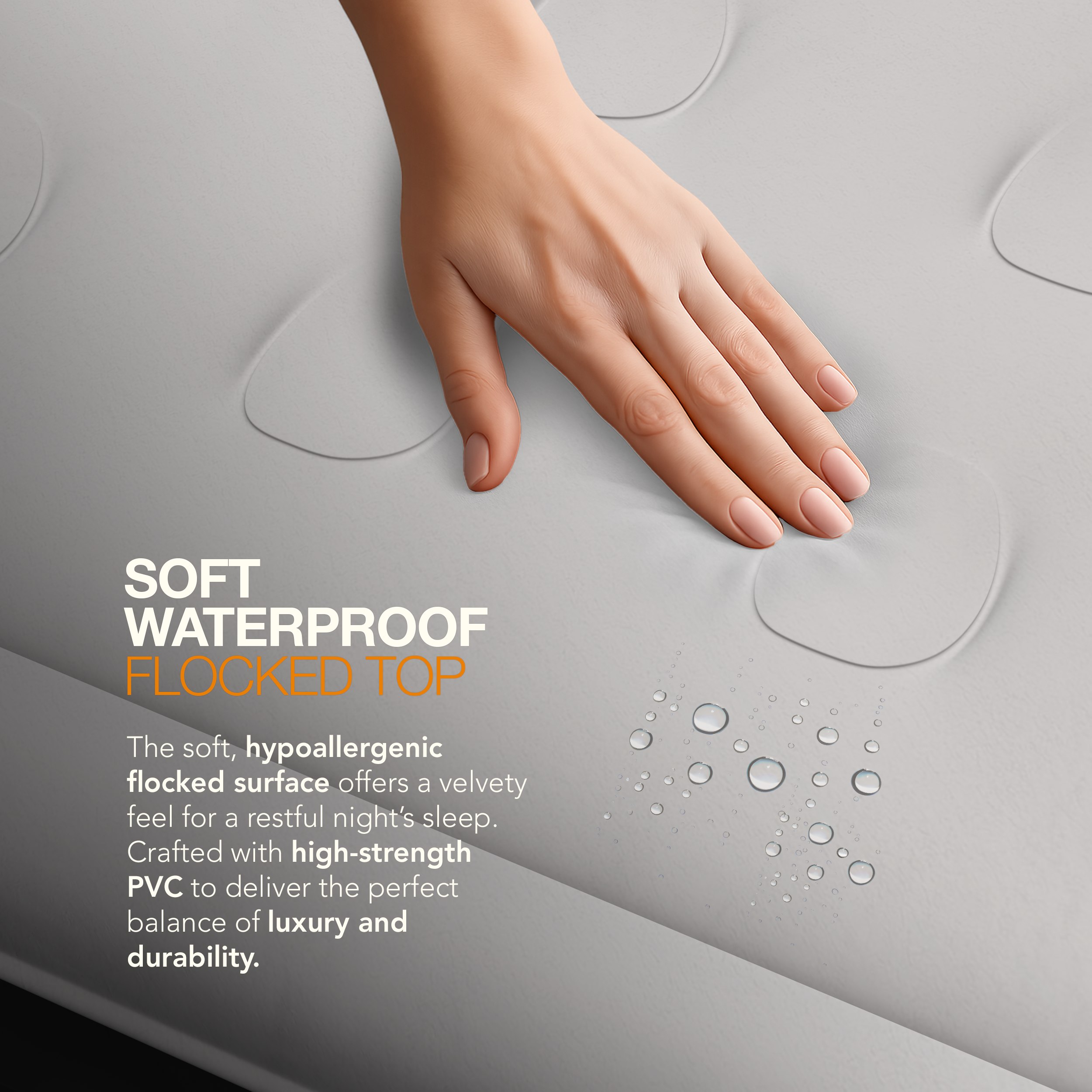 - Durable & Waterproof: Made from extra-thick, 5-gauge puncture-resistant PVC, the bed is built to withstand pressure, spills, and daily use. The flocked waterproof top adds comfort, while the non-slip base and edge support keep it stable and maximise sleeping space.