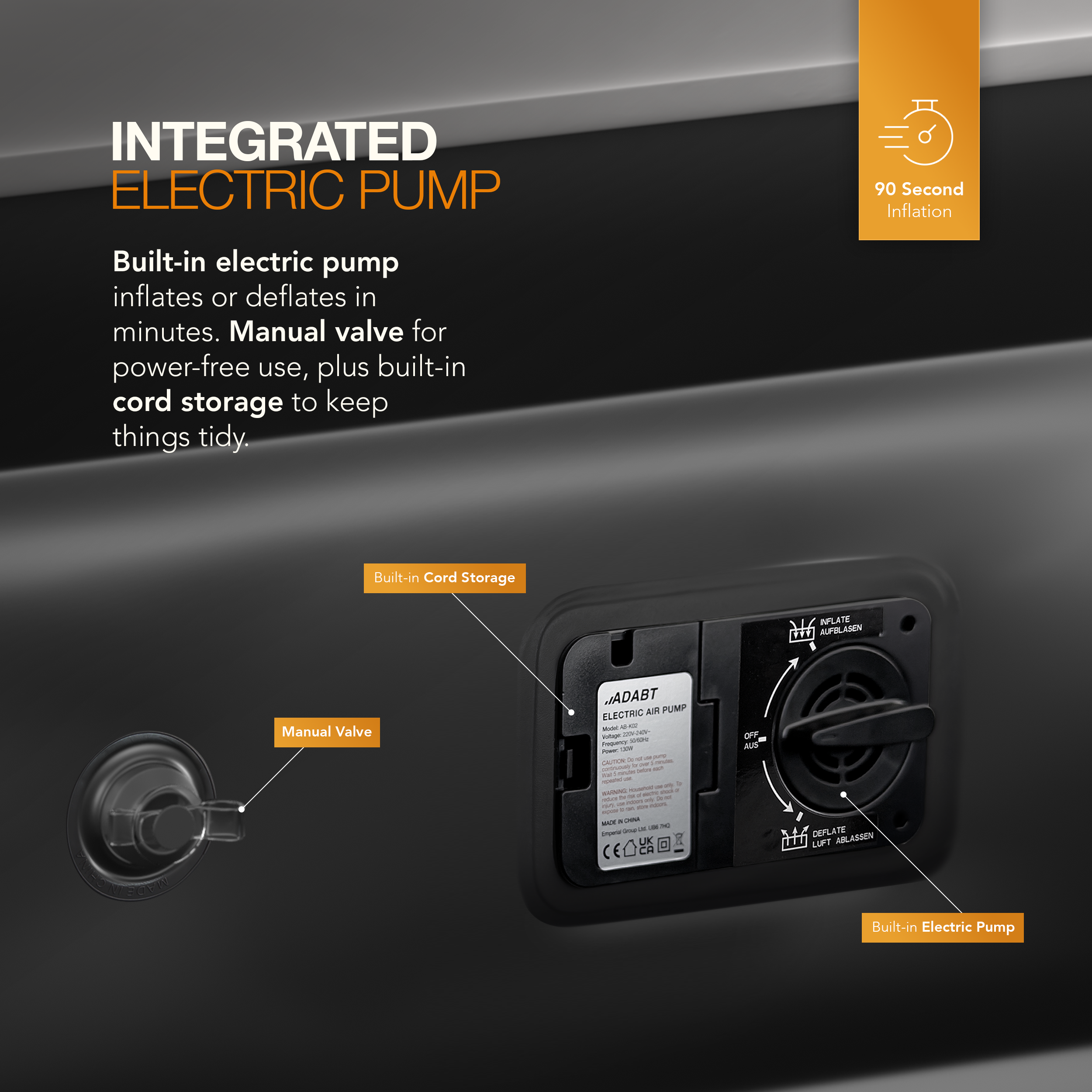 - Built-in Electric Pump: The ADABT air bed features a powerful built-in electric pump that fully inflates your air mattress in just 90 seconds. Easily adjust the firmness with a simple dial, and deflate quickly for compact storage. Ideal for guests, camping trips, and everyday use.