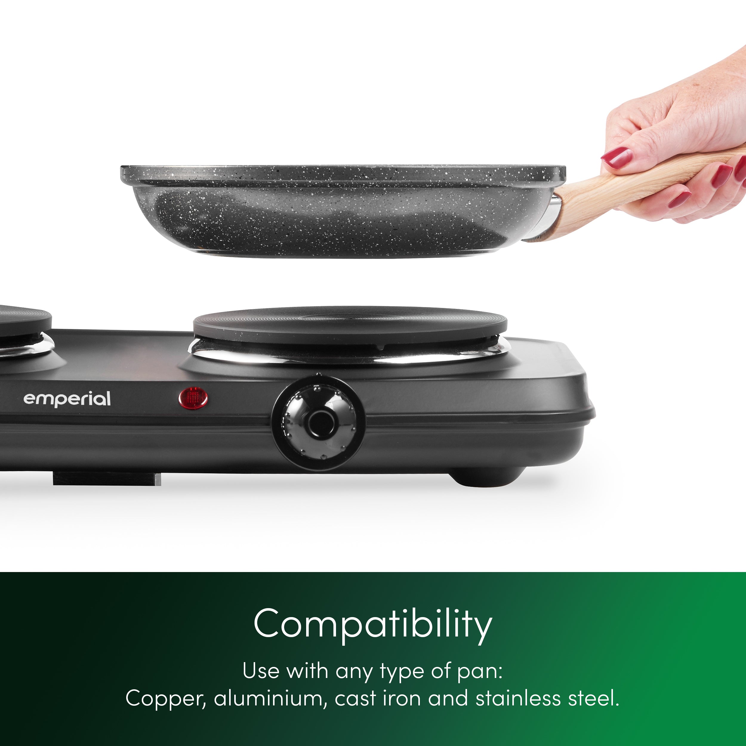 - Cast Iron Electric Hotplates - Consists of 2 hotplates made from durable cast iron that provides quick and sustained heating. Works with aluminium pans, copper pans, cast iron frying pans, non-magnetic stainless steel pans and more!