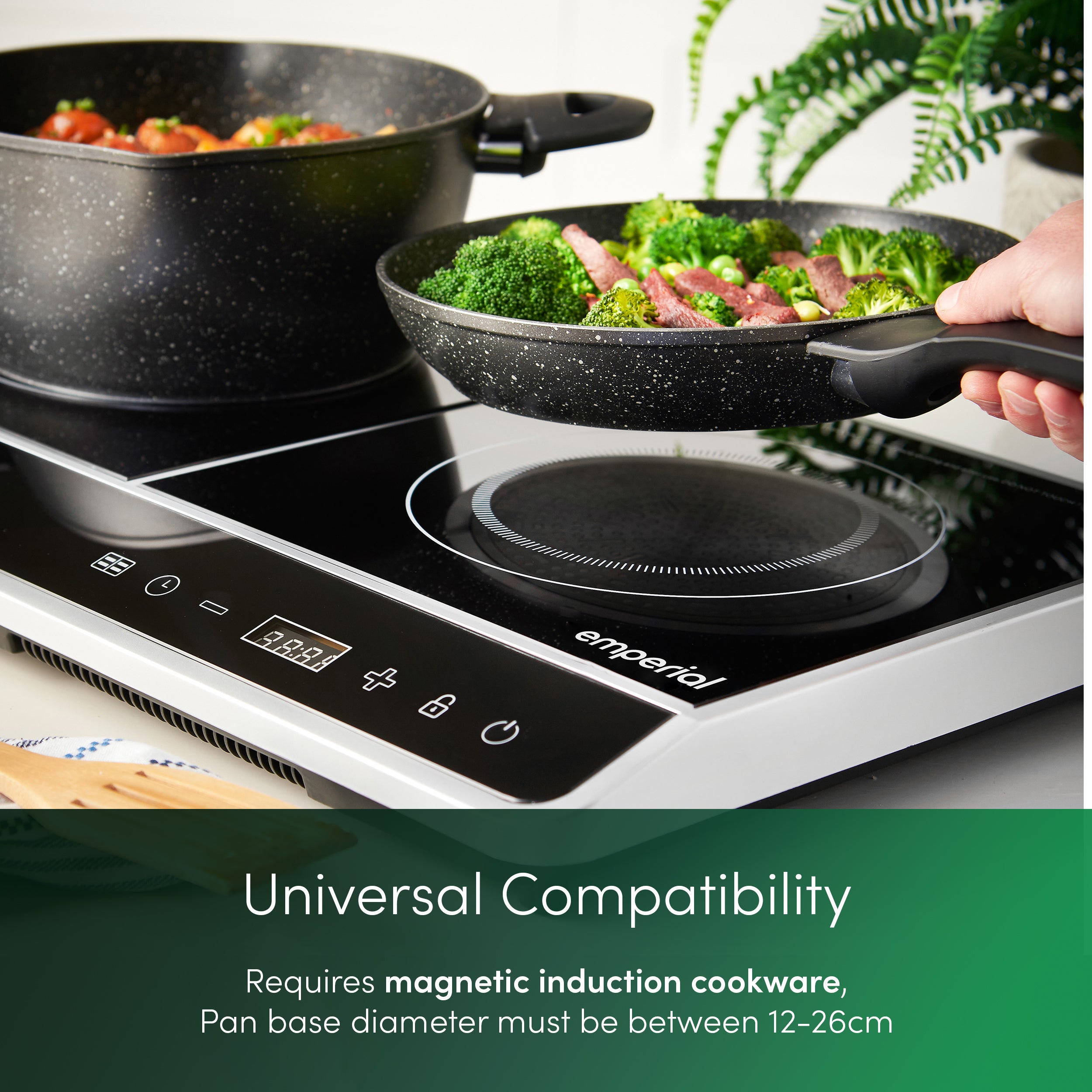 - Compatibility - The twin induction hob is compatibility with a range of pans with magnetic induction base. Pan base diameter must be between 12-26cm