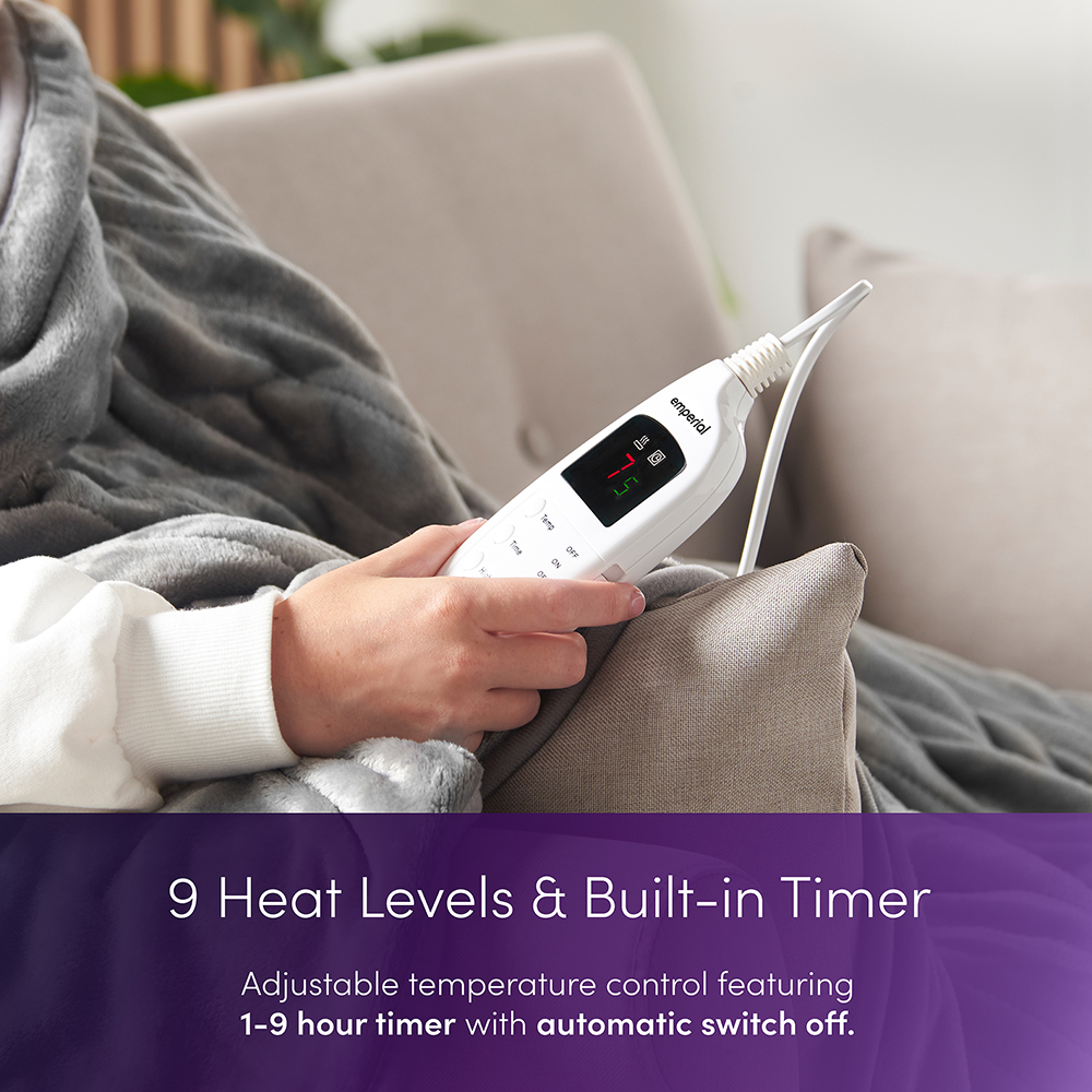 - 9 Heat Settings & 9 hour Timer - Use the remote control to select from 9 adjustable heat settings for your desired warmth. With a built-in 9 hr timer and auto cut-off feature, you can fall asleep without worry as the heating will switch off after timer ends.