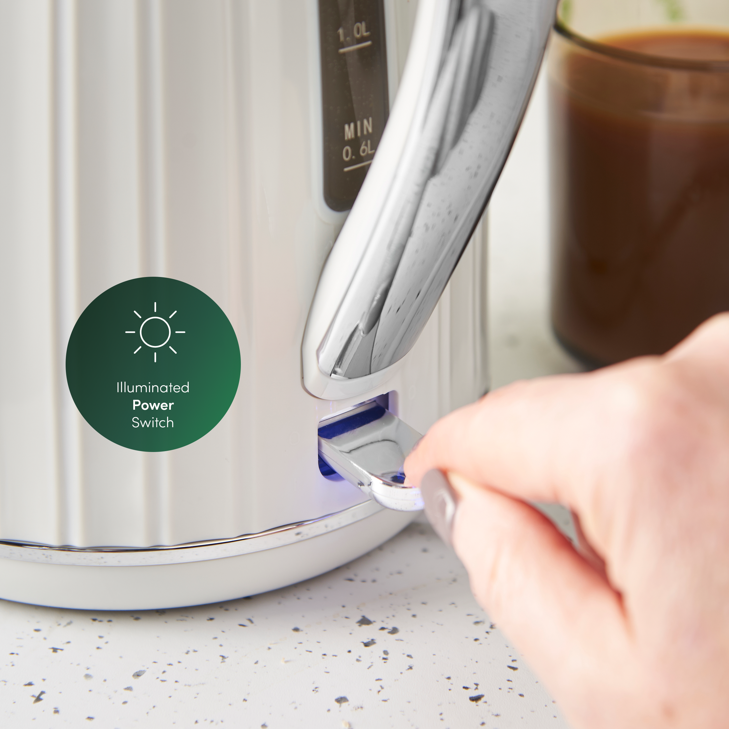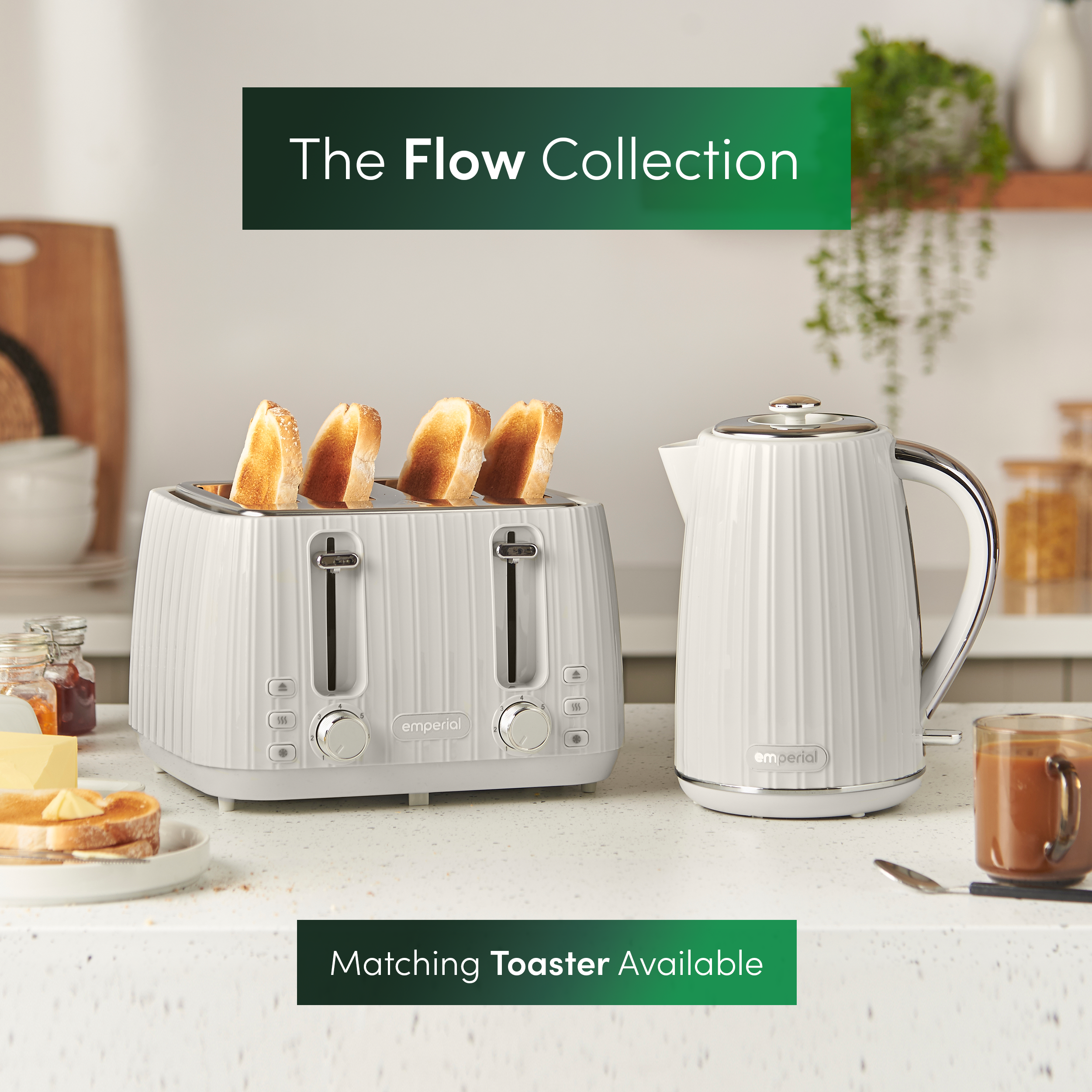 - Flow Collection - Featuring a stylish high-gloss textured finish with chrome accents, this kettle is part of the elegant Flow Collection. Complete the look with the matching toaster for a coordinated kitchen set.