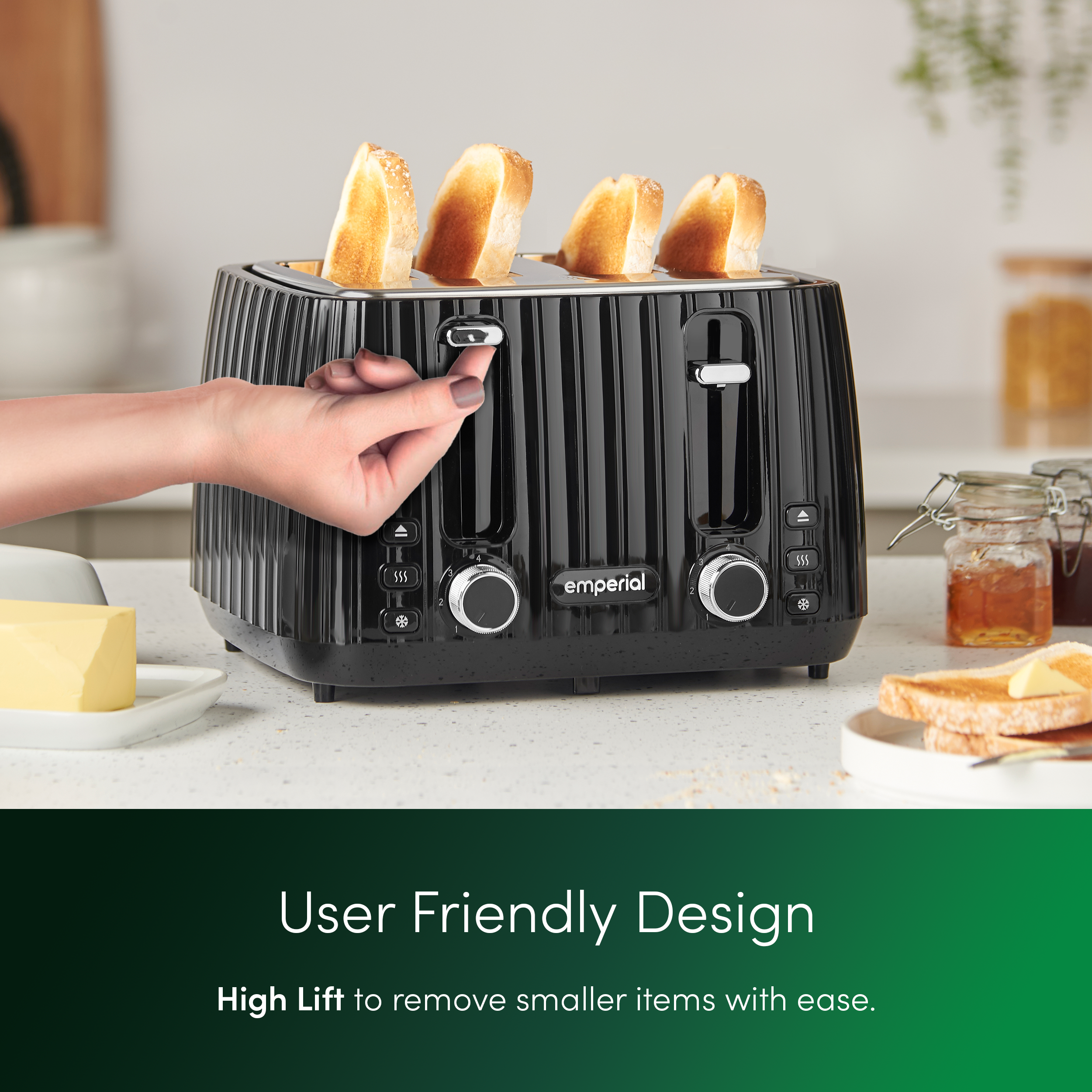 - High Lift & Self-Centring Slots - Easily remove smaller items like crumpets, tea cakes and muffins without burning your fingers. Self-centring guides keep bread in the perfect position for even toasting on both sides.