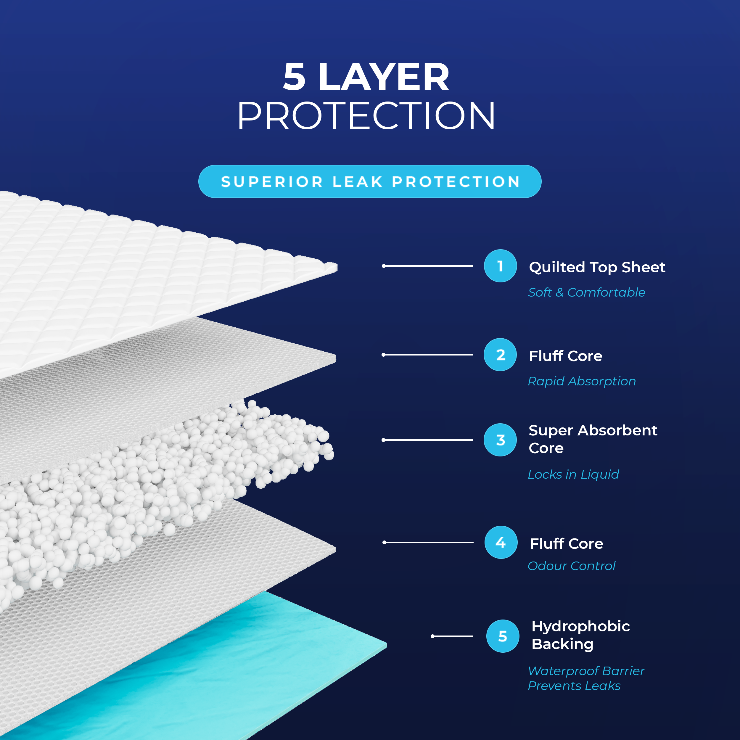 - Ultimate Leak Protection: Built with a premium 5-layer design including a high-absorbency virgin fluff core and a waterproof polymer backing sealed on all sides. Offers reliable protection from leaks-even under pressure - keeping bedding and surfaces dry.