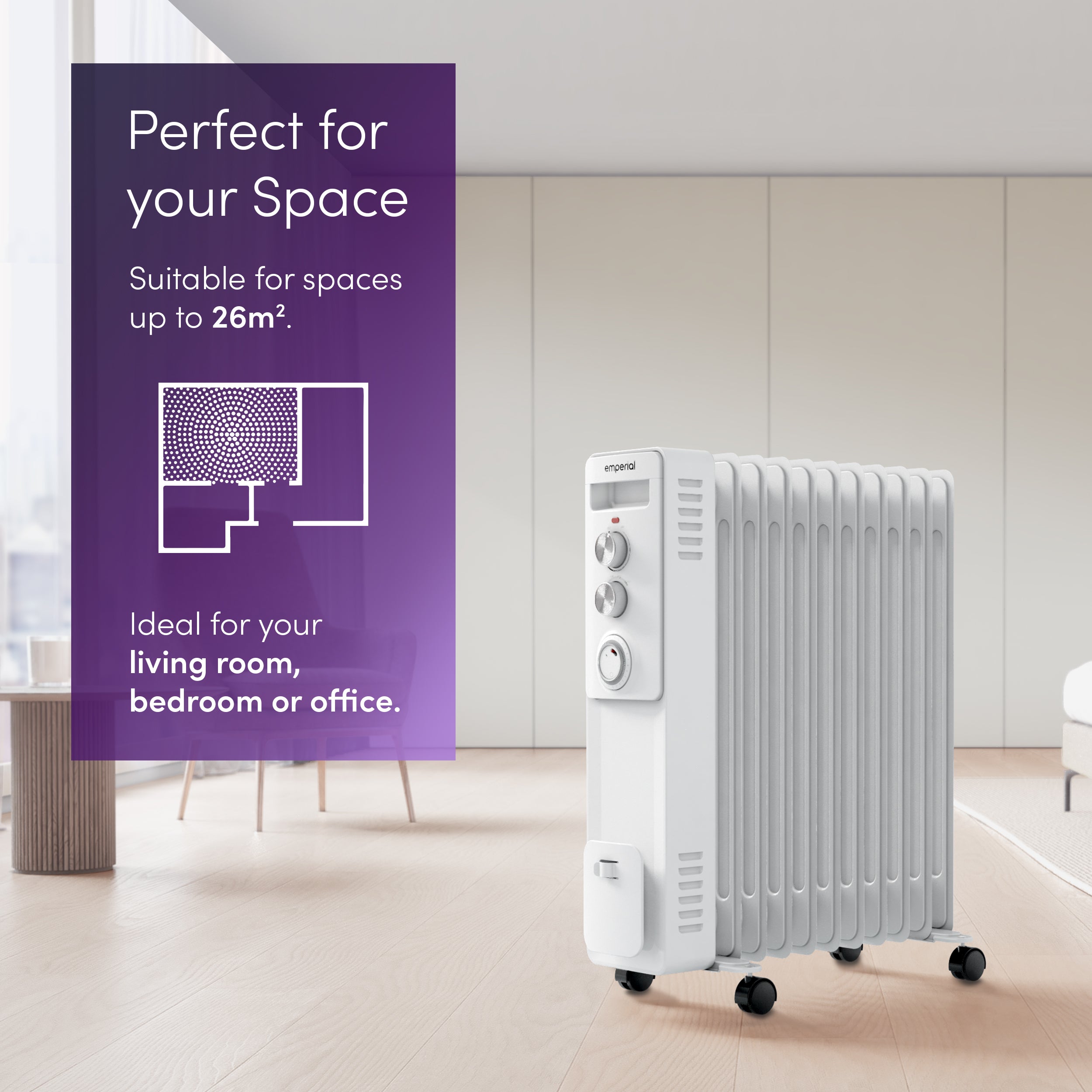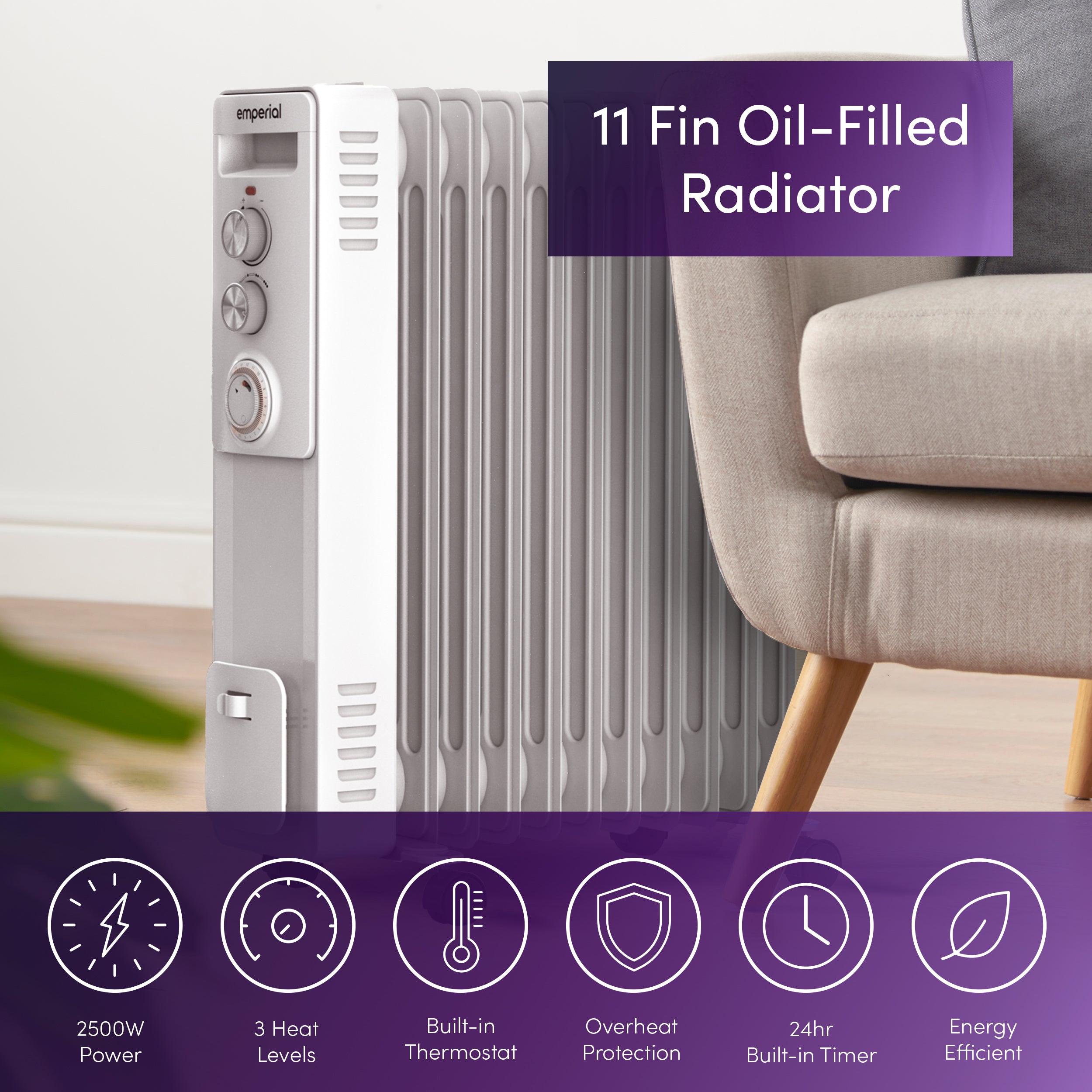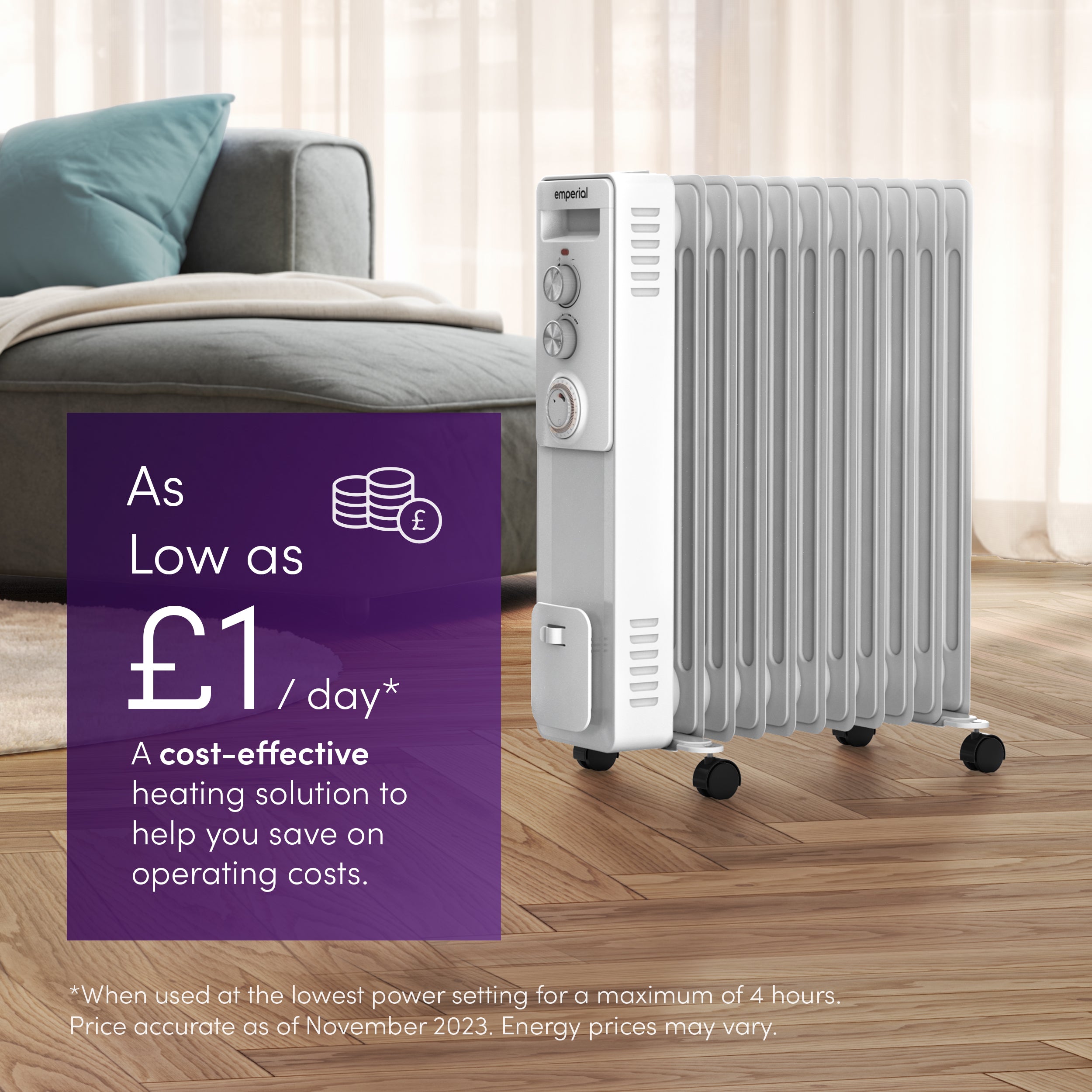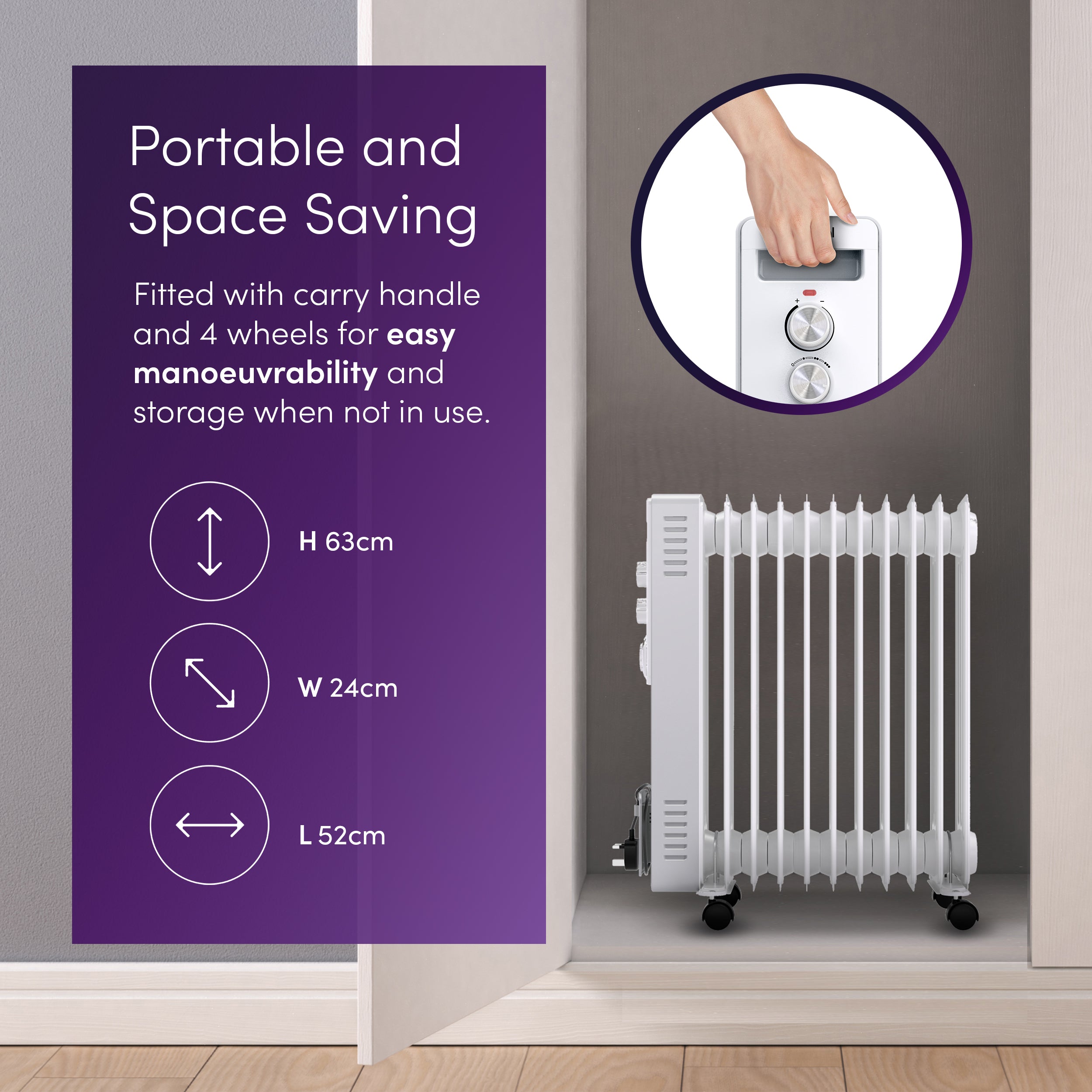- Powerful and Efficient Heating - 2500W Oil filled radiator featuring 11 fins that will quickly and efficiently circulate hot air throughout your home, office or living room. A cost-effective heating solution as low as £1/day to save on your energy bills during cold periods.