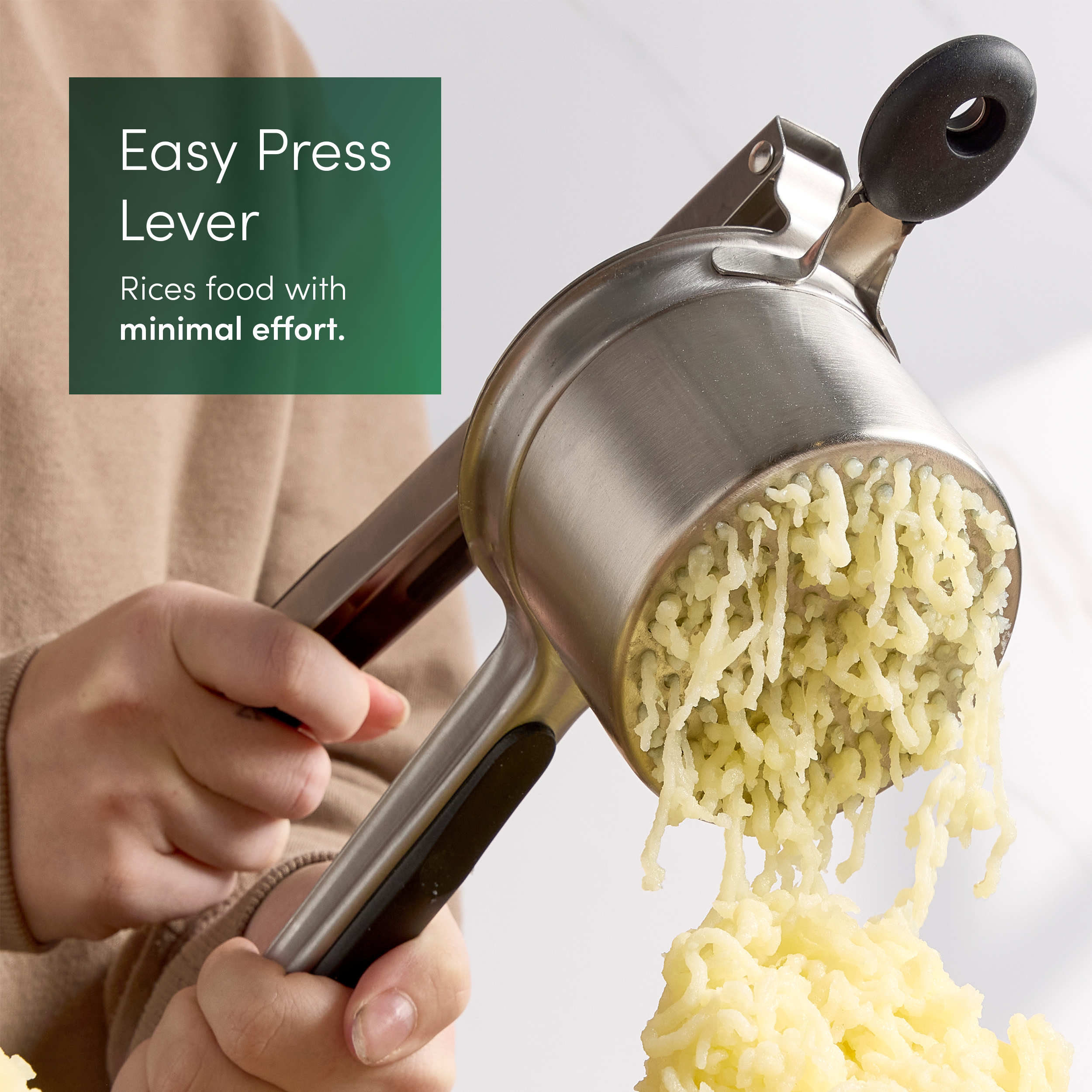 • Easy to clean & store – The ricer comes apart easily for cleaning and is fully dishwasher safe. Finished with a built-in hanging hook for easy access and space-saving storage.