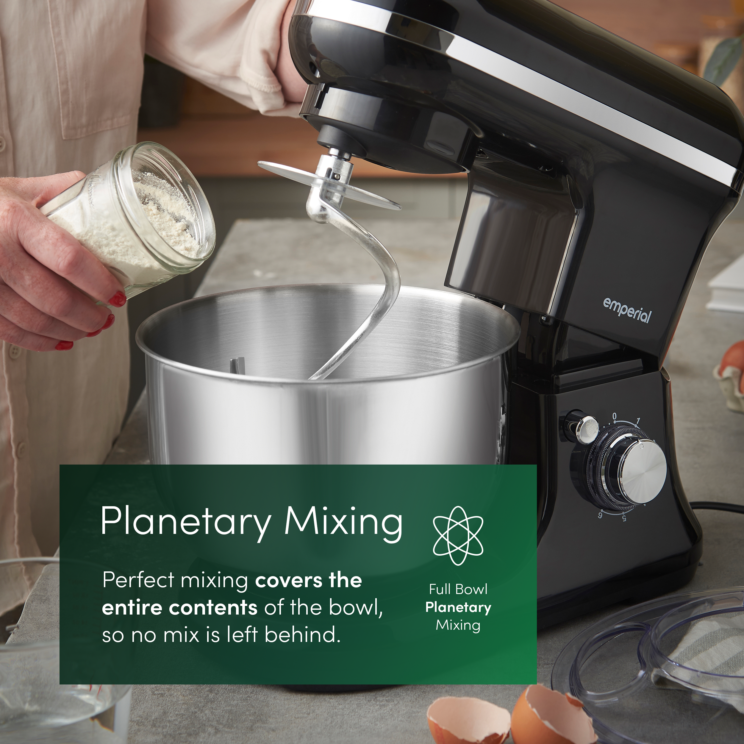 - Planetary Mixing Action - Ensures ingredients are fully and evenly combined by reaching every part of the bowl - perfect for smooth batters, fluffy cakes, and well-kneaded doughs.