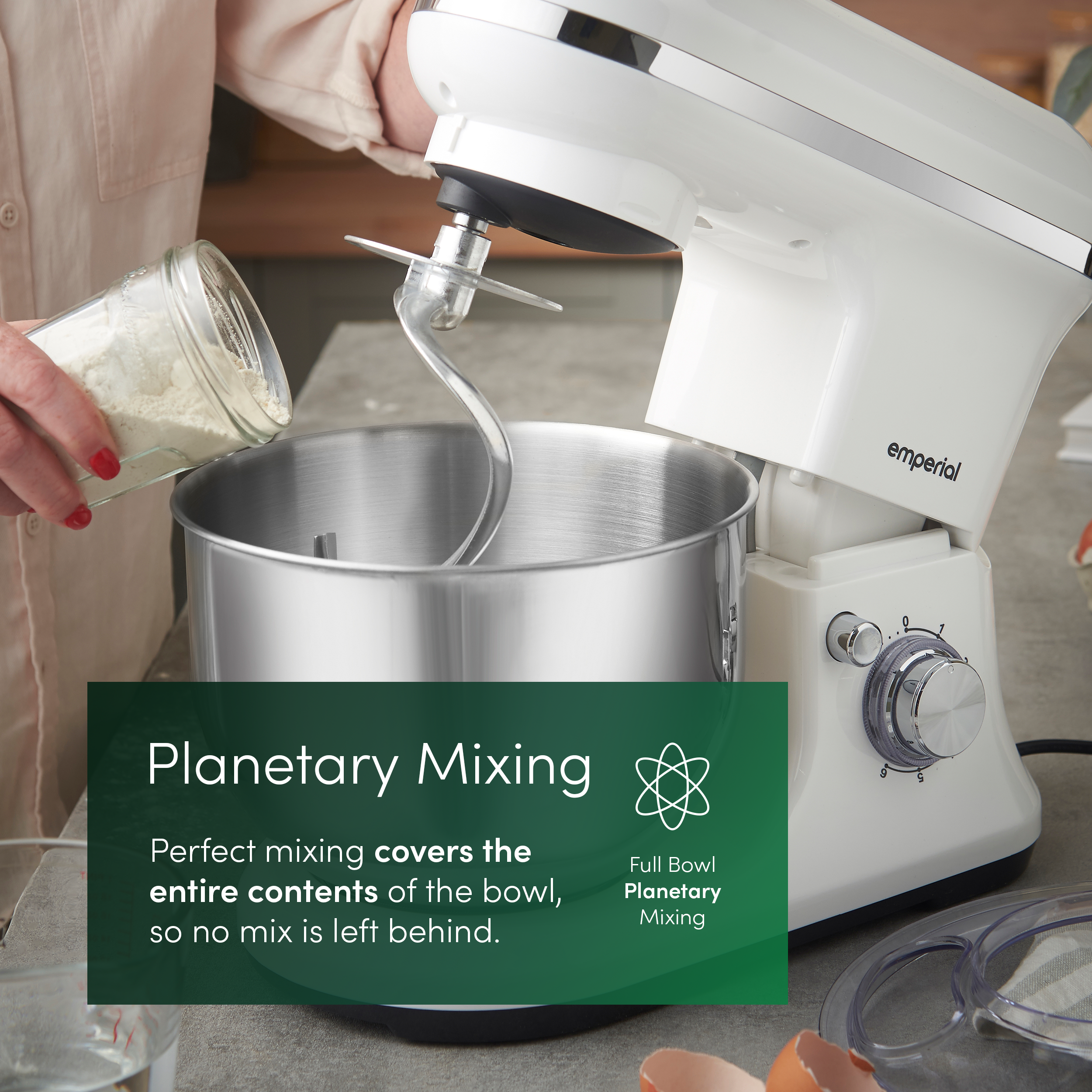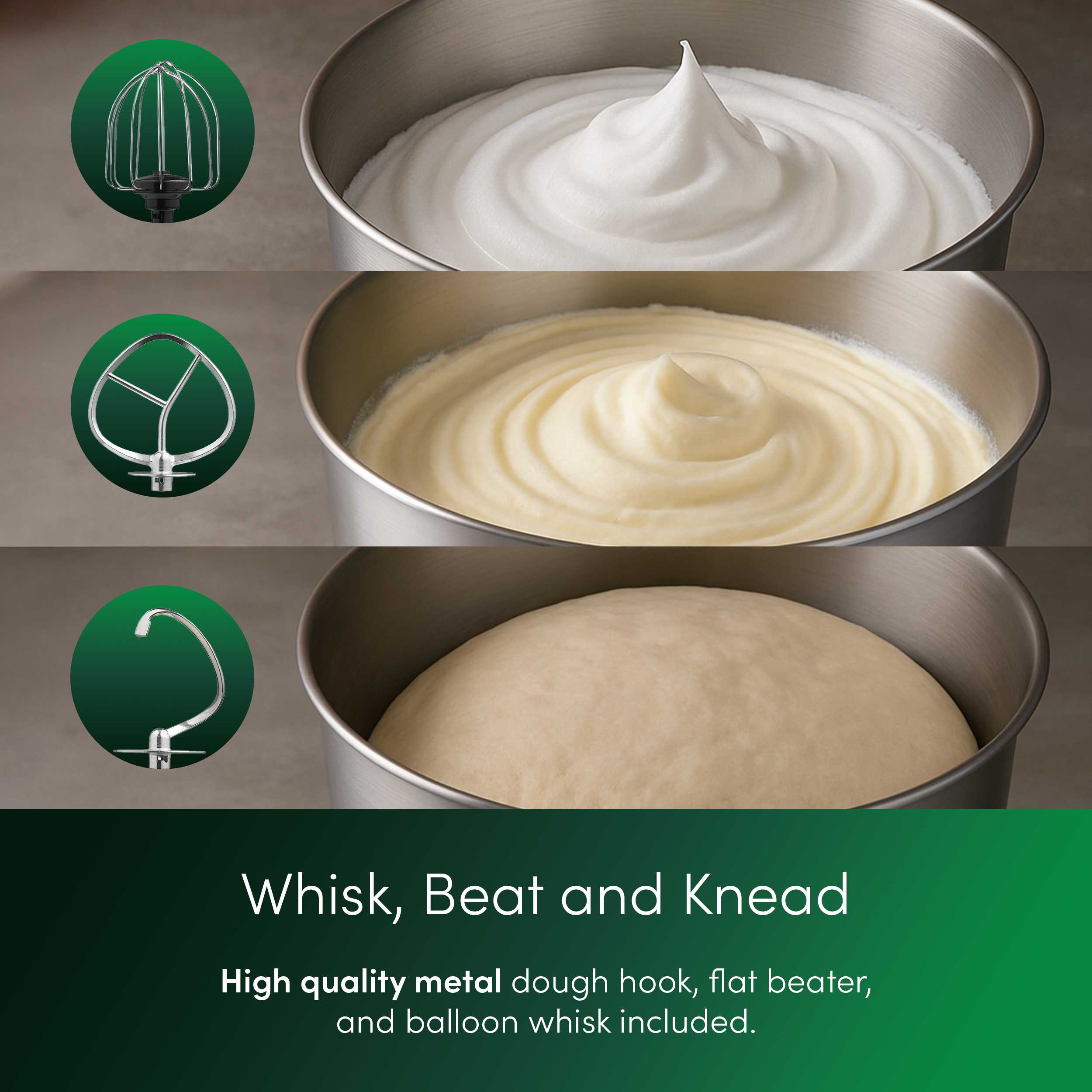 Planetary Mixing Action - Ensures ingredients are fully and evenly combined by reaching every part of the bowl - perfect for smooth batters, fluffy cakes, and well-kneaded doughs.